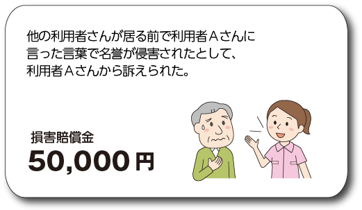 勤務中に言葉などにより、利用者さんや他のスタッフ等の自由、名誉またはプライバシーを侵害し、法律上の賠償責任を負った場合に保険金をお支払いします。