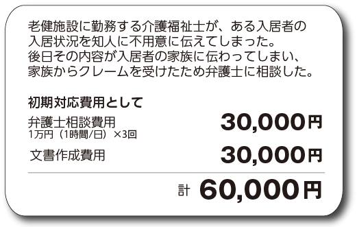 被保険者の業務に関連して発生した第三者とのトラブルの解決について、被保険者に支払いが発生した弁護士等の相談費用や文書作成費用等をお支払いします。