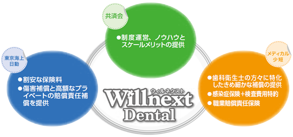 「Willnext-Dental」は、一般社団法人日本看護学校協議会共済会と東京海上日動火災保険(株)およびメディカル少額短期保険(株)が緊密な連携のもと、歯科衛生士や歯科助手の方々の立場に立った補償制度の提供を行います。